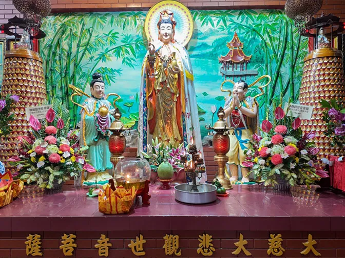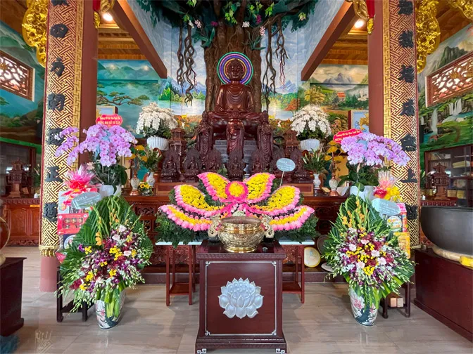 Vòm hoa sen nở rộ phía trên tượng Phật, biểu tượng cho sự thanh tịnh và giác ngộ. Cánh hoa uốn cong mềm mại, tỏa sáng đầy linh thiêng....
