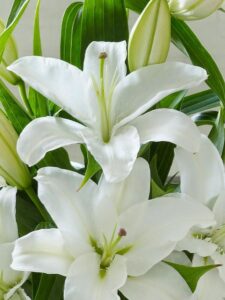 Hoa ly trắng: là một trong những loài hoa mang vẻ đẹp thanh khiết và sang trọng nhất trong các loại hoa dùng cho tang lễ. Với những cánh hoa mềm mại, tinh khôi và hương thơm nhẹ nhàng, ly trắng biểu hiện cho sự thanh cao, trang nhã và là biểu tượng của lòng kính trọng sâu sắc dành cho người đã mất.